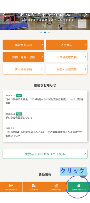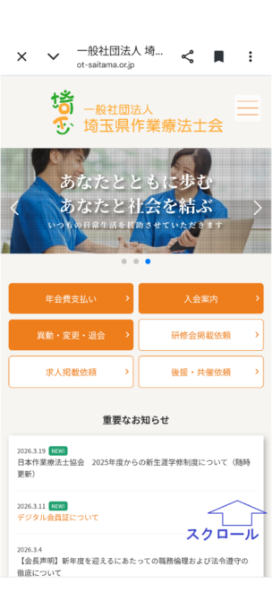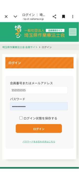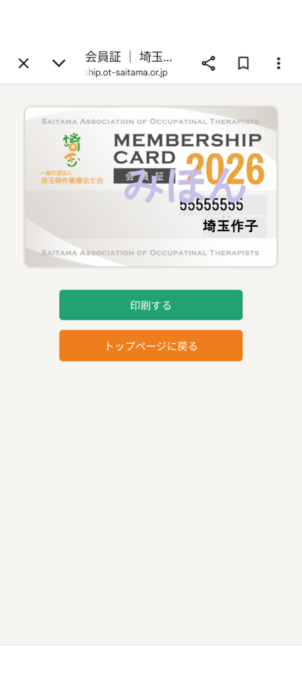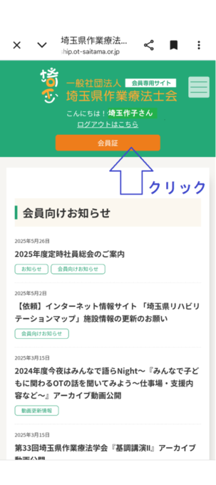 デジタル会員証表示のお知らせ calendar_today 2026.4.20 デジタル会員証が表示されるようになりました。当年度県士会費を納入後、数日でデジタル会員証が表示されます。下の手順に従って表示させてください。 なお、当年度会費未納の場合は、会費納入のページへのリンクが表示されます デジタル会員証の表示方法 埼玉県作業療法士会ホームページを表示し、画面を上方にスクロールする 会員専用ページボタンをクリック メールアドレスとパスワードを入力 上方の会員証ボタンをクリック 会員証が開きます