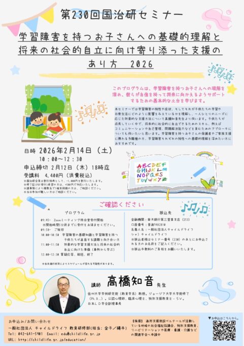 - 第230回国治研セミナー「学習障害を持つお子さんへの基礎的理解と将来の社会的自立に向け寄り添った支援のあり方2026」