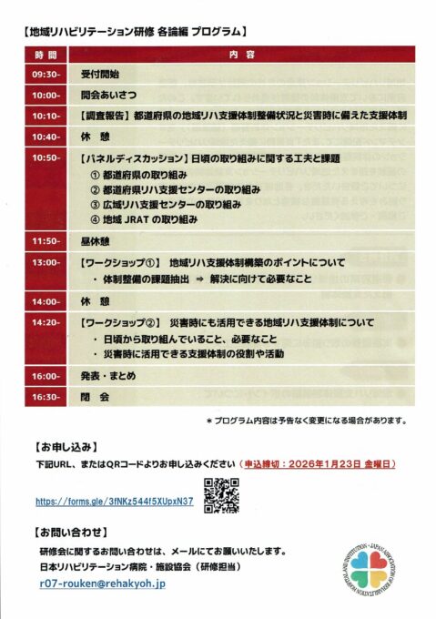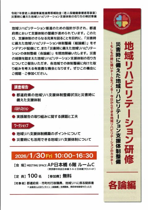 本会が厚生労働省より採択を受け実施しております、令和7年度老人保健健康増進等事業 「災害時に備えた地域リハビリテーション支援体制の在り方の検討事業」の一環として、 表題研修会を開催いたします。