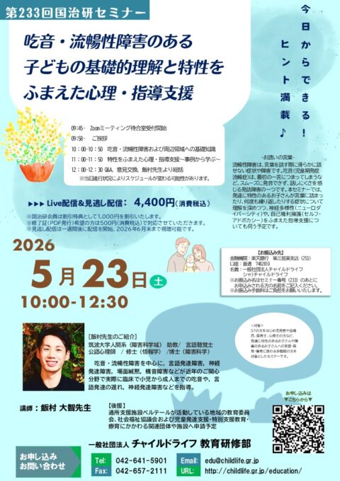 第233回国治研セミナー 吃音・流暢性障害のある子どもの基礎的理解と特性をふまえた心理・指導支援:一般社団法人 チャイルドライフ オンラインセミナー 第233回国治研セミナー 吃音・流暢性障害のある子どもの基礎的理解と特性をふまえた心理・指導支援 主催:一般社団法人 チャイルドライフ 開催地 Zoom(オンライン) 開催日時 2026年5月23日(土)10:00~12:30 定 員 50名 参加費 4,400円 参加申込方法 上記リンク先からホームページに入り、お申込みフォームにご入力ください。 https://childlife.gr.jp/education/s-entry/ ↗