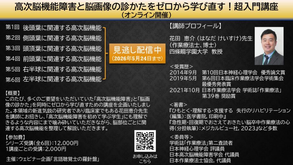 高次脳機能障害と脳画像の診かたをゼロから学び直す!超入門講座:ウェビナー企画「言語聴覚士の羅針盤」 Warning: Undefined array key "file" in /home/otsaitama/ot-saitama.or.jp/public_html/site/wp-includes/media.php on line 1788 オンラインセミナー 高次脳機能障害と脳画像の診かたをゼロから学び直す!超入門講座 主催:ウェビナー企画「言語聴覚士の羅針盤」 開催地 オンライン開催(アーカイブ配信) 開催日時 視聴可能期間:2026年5月24日(日)23:59まで 定 員 無し 参加費 一講座ずつの受講:2,000円(税込) シリーズ受講(全6回):12,000円(税込) 参加申込方法 以下のURLから参加登録をお願いいたします。 お申し込みにはチケット販売サイト「Peatix」へのご登録が必要となります。 https://compass10.peatix.com/view ↗