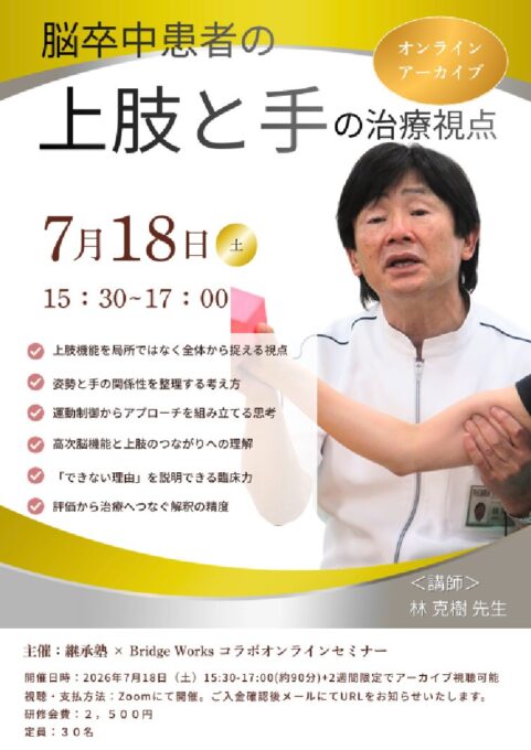 脳卒中患者の上肢と手の治療視点について学ぶオンライン研修会です。